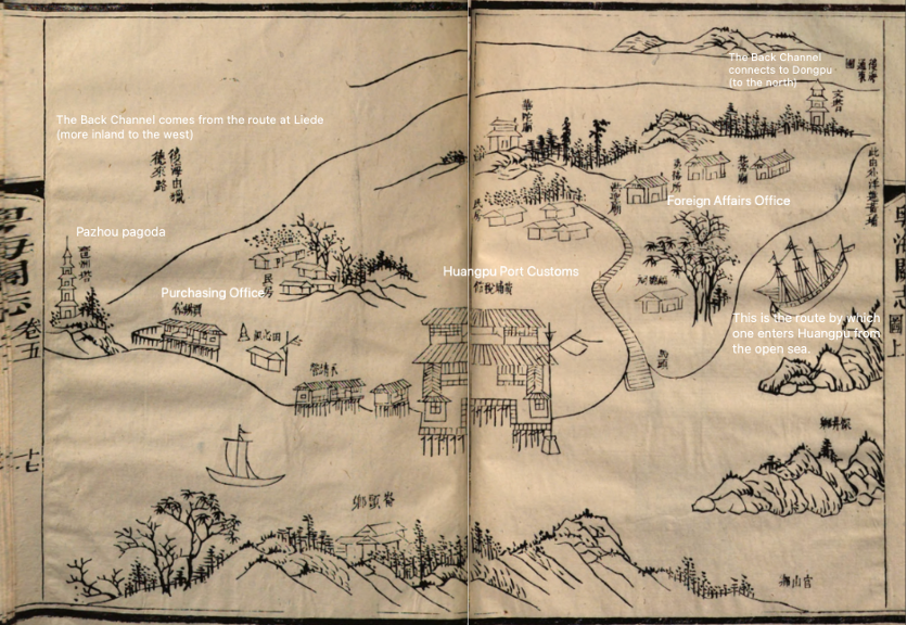 In other illustrations of ports within these two chapters, such as that of the Huangpu (Whampoa) Port 黃埔口圖 (Figure 5), the customs office also features prominently in the center, labelled as the Huangpu Port Customs 黃埔稅館. The repeated centering of customs offices in these port illustrations underscores that regulation and taxation were the primary concerns from Liang’s perspective. This port, located about thirty li downstream on the Pearl River from Daguan, functioned as a registration port, where Liang recorded that many foreign vessels carrying rice docked. At the same time, Huangpu was also a notorious hub of the illicit opium trade: despite successive prohibitions between 1809 and 1817, smuggling thrived through collusion between local officials and merchants, and opium was even openly exchanged at both Macau and Huangpu itself.