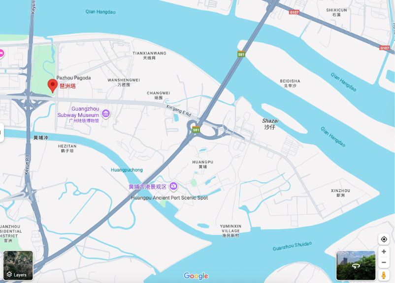 Unlike the other examples discussed, this illustration adopts a composite bird’s-eye view, directing the viewer to look obliquely from the top right at Huangpu’s layout and its integrated water-gateway system. The government established two key institutions in Huangpu: a Foreign Affairs Office (夷務所), which managed interactions and regulations concerning foreign ships and crews, and a Purchase Office (買辦館), which facilitated communication and transactions between foreign traders and local officials. Both are present in the illustration. Using a contemporary digital cartographic map as a reference (Google Maps, Figure 6), the Back Channel, now marked as “Qian Hangdao,” connects westward to Liede Village 獵德 and northward to Dongpu 東圃 District; the front waterway represents the route by which “one enters Huangpu from the open sea.” By clearly delineating these waterways and their directions, the illustration effectively situates Huangpu within a larger fluvial network, thus demonstrating the logistical routes by which foreign ships were admitted and registered.