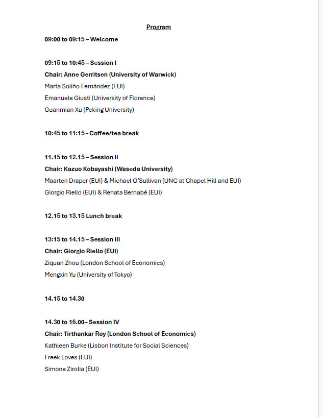 Capitalising on the concentration of scholars in and around the ERC-funded CAPASIA project (capasia.eu), this one-day workshop brings together scholars interested in early-modern Asia at the EUI. The workshop seeks to foreground new research on the circulation of people, commodities, ideas, and capital across Asia during this period. The papers will cover a wide range of perspectives, including economic, environmental, cultural, and art historical approaches. Speakers will circulate a short paper in advance of the workshop and deliver a 15-minute in-person presentation.