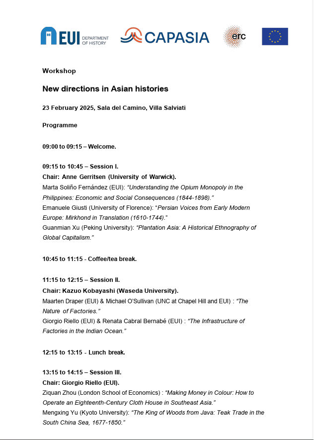 Capitalising on the concentration of scholars in and around the ERC-funded CAPASIA project (capasia.eu), this one-day workshop brought together scholars interested in early-modern Asia at the EUI. The workshop sought to foreground new research on the circulation of people, commodities, ideas, and capital across Asia during this period. The papers covered a wide range of perspectives, including economic, environmental, cultural, and art historical approaches.